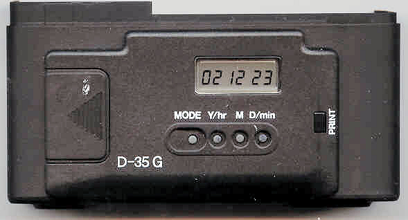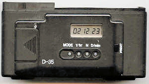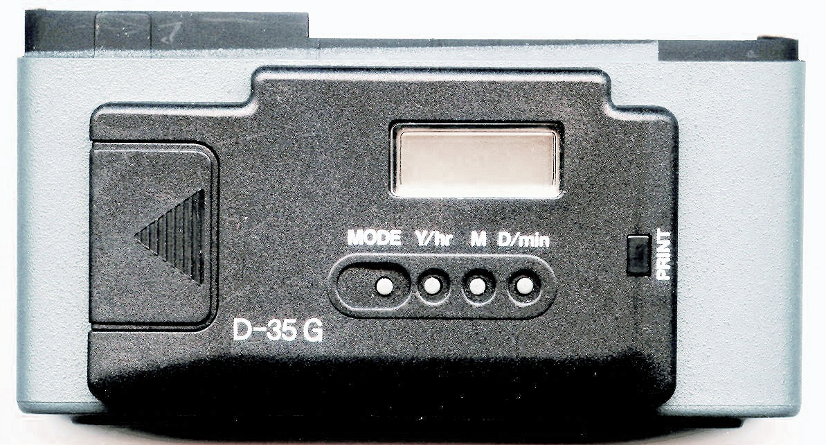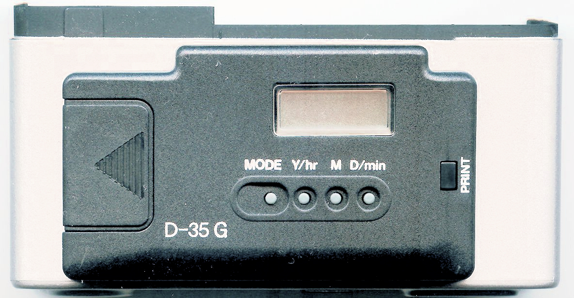 Ich weiß nicht genau warum man diese braucht, aber für Pedanten, welche durch Zahlen im Bild nicht gestört werden gibt es sowohl für die GT und ML Serie Datenrückwände. D-35G für die GT-Serie und D-35/D-35M für die ML-Serie. Für GTE-II (neu), GT-S und GT-X gibt es farblich passende Rückwände. Technisch sind sie mit der D-35G identisch und diese passt auch auf diese Cameras, sieht bloß nicht schön aus. D-35G und D-35/D-35M sind fast identisch, auch in der Bedienung und zeigen entweder Datum oder die Zeit an, welche sich per Knopfdruck in eine der unteren Ecken einblenden lässt. Die Bedienknöpfe sind winzig und aus Weichgummi, echt etwas für japanische Hände. Beide brauchen eine Lithium CR2025 3 Volt Batterie. Der Filmtransport um ein ganzes Bild braucht 2 Aufzugbewegungen des Filmtransporthebels. Blendet man die Zeit oder das Datum, beides gleichzeitig geht nicht, nach der Aufnahme ein, erscheint sie in der linken untern Ecke des Bildes. Blendet man eines von Beiden nach der ersten Aufzugsbewegung ein, erscheint Datum oder Zeit in der rechten untern Ecke des Bildes; wird weiter transportiert kann dann nach der Aufnahme links unten noch mal Zeit oder Datum einblendet werden. Somit kann man beides einblenden: Zeit und Datum, jeweils in einer anderen Ecke.