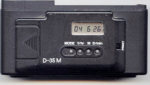 Das ist die Ausführung für die MB/ML-Serie (D-35). Die Empfindlichkeitseinstellung ist zweifarbig und in ASA und DIN bis 1600ASA. Mit der Mode-Taste wird entweder zwischen Datums- und Zeitanzeige gewechselt oder Zeit/Datum eingestellt. Links unter dem geriffelten Pfeil liegt die Batterie. Rechts die Print-Taste, mit der Datum oder Zeit einblendet wird. Das Datumsformat ist „amerikanisch“, falsch herum. Die Zeit im, 24 Stundenformat. Für die MB/ML gibt es eine ausgewiesene Rückwand D-35M, ist mit der D-35, bis auf die Bezeichnung, identisch die Farbe auch, obwohl sie auf den Scans etwas anders aussieht.: