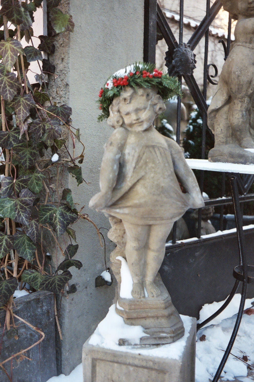 Im Winter in einem Hinterhof. Irgenwer hat der Statue noch einen Kranz aufgesetzt. |