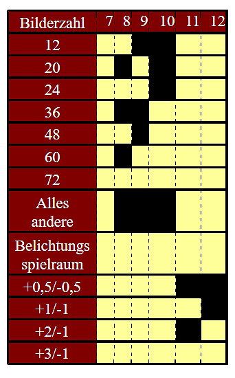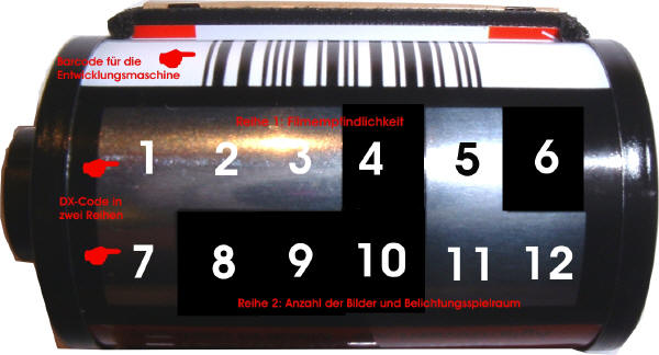 Auf betreiben der Firma Kodak wurde 1994 unter der Spezifizierung ANSI/NAPM Standard IT1.14:1994 als internationale Norm für Kleinbildfilmpatronen eingeführt. Gar nicht so alt. Sie beinhaltet einmal einen Bar-Code für die Entwicklungsanstalt/maschine und einen Code für die Kamera. Aufgebaut ist der Code in zwei Reihen zu je 7 Feldern und basiert auf der elektrischen Leitfähigkeit der einzelnen Felder. Das erste Feld jeder Reihe, oder bei Durchnummerierung der Felder die Felder 1 und 7, ist immer silbrig, ich nehme an es ist der „Massekontakt“ für die anderen Felder. Die obere Reihe kodiert mit den Feldern 2-6 die Empfindlichkeit, die untere Reihe die Anzahl der Bilder auf der Filmrolle und den Belichtungsspielraum der Emulsion: