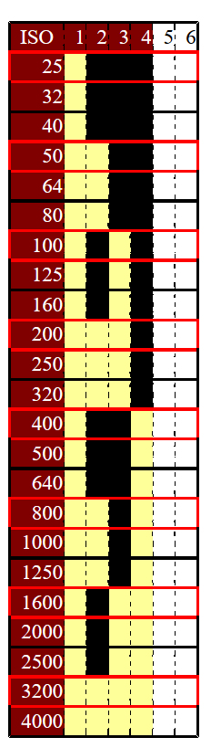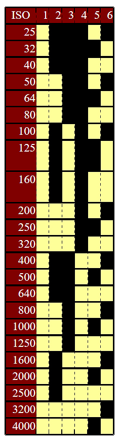 Mit 4 Stiften, von denen 3 kodieren und einer die Masse bildet, sind nur die Empfindlichkeitsstufen ISO 25-50-100-200-400-800-1600-3200 möglich, jedes mal ein Verdoppelung der Empfindlichkeit. Ganz schön clever aufgebaut. Ein ISO 64 Film wird wie ein ISO 50 oder 80 gelesen.