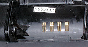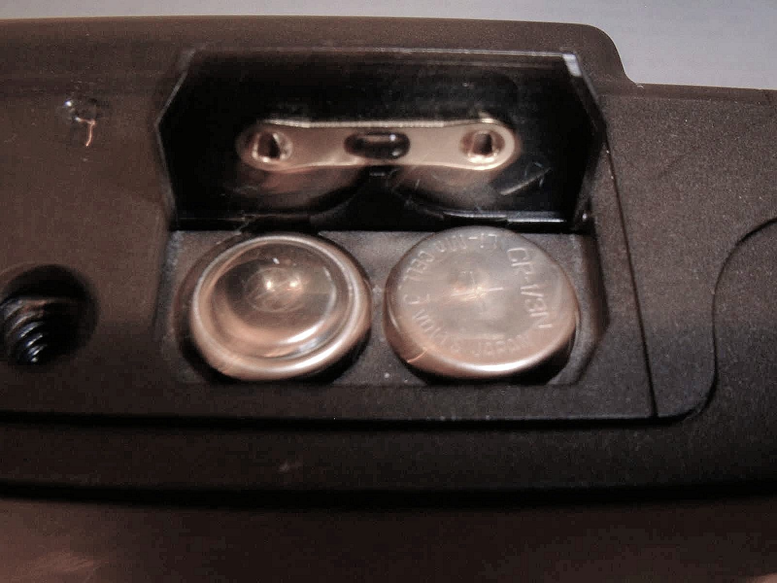 Die Entriegelung für den Filmtransport liegt neben dem Stativgewinde. Das Batteriefach ist nicht ganz einfach zu öffnen: „Nach leichtem Druck durch den Daumennagel springt der Schutzdeckel auf“. Von wegen, man muss die geriffelte Platte nach vorne drücken und deren hintern Rand mit einem Nagel hochziehen. Die Kerbung am vorderen Rand ist überflüssig und verwirrt. Dann sieht man die beiden Batterien CR 1/3 N:
