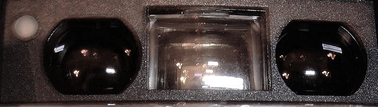 Die Elemente unter der Schutzabdeckung: Links oben die Selbstauslöser-LED. Dann ein IR-Sensor, der Sucher, dann der zweite IR-Sensor.