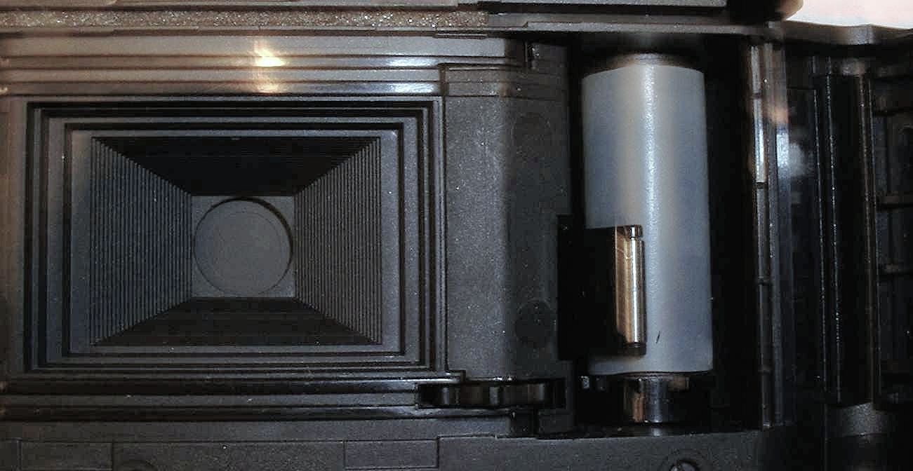 Links das Sichtfenster für den Filmtyp. Im Sucher sieht man nichts, nur den Bildrahmen mit einer Markierung für den Parallaxenausgleich ab 1,5 Meter; keine Zeiger, keine Dioden, nichts.