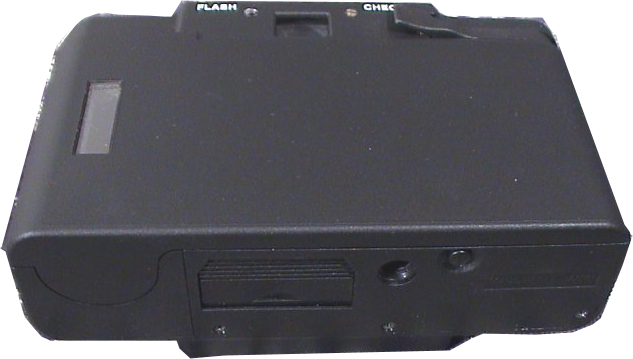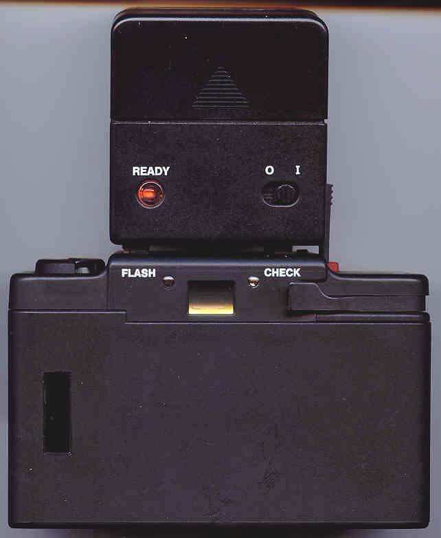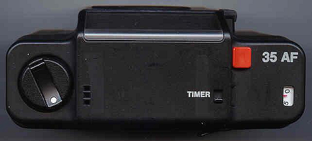 Blitz ist hier montiert. Der Sucher sowie die zwei Infrarot Sensoren des Autofokus liegen hinter einer klaren Kunststoffabdeckung. Links neben dem Objektiv ist ein nach unten zu drückender Schieber, mit dem die Elektronik angeschaltet wird. Ist die Camera eingeschaltet, ist ein roter Punkt zu sehen. Die Elektronik schaltet nach ca. 10 Minuten von selber aus. Danach muss man den Schalter schließen und wieder öffnen um die Camera wieder in Gang zu bringen. Der Typen- (in weiß) und Herstellerschriftzug (in rot) ist gut sichtbar unterhalb des Objektivs angebracht.