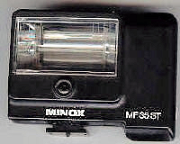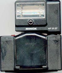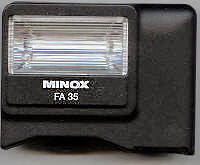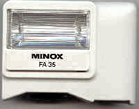 Der erste Minox Blitz war der FC 35. In Minox schwarz und genau der Form des E-Gehäuses angepasst. Für seine Größe erstaunlich lichtstark. Aber keine Blitzkontrolle und kein Serienthyristor, welche „unverbrauchte“ Energie in den Kondensator zurückspeist und somit eine schnellere Blitzfolge erlaubt. Frühe Modelle erlauben keinen Betrieb mit Akkus. Der Blitz ist hoch genug, um „rote Auge“ zu vermeiden. Die Ausleuchtung ist für das Aufnahmefeld des35mm Objektivs recht gleichmäßig. Für die weiße AL-Kamera gibt es eine weiße Ausführung der Blitz FA. Mit Serienthyristor heißt er dann FC 35 ST. Die Nachkommen des FC 35. FC-E und FC-S, sind heute noch bei Minox zu kaufen. TC 35 und MF 35 leider nicht mehr. Preis 1989: DM 96.-; mit Etui DM 106.- .