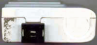 Links sind die Krallen für den elektrischen Kontakt mit der Camera zu sehen. Rechst die Federklammer, mit der der Blitz auf der Camera fixiert wird. Alles in allem eine hakelige Sache. Batterien werden hinten eingefüllt.