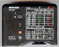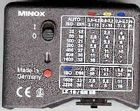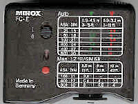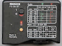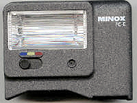 Die GT-E II hat eine besondere Oberfläche, „graphit-schwarz“ und mit einer griffigen, fast weichen Oberfläche. Bei Minox heißt das „Softtouch“. Dazu brauch es auch einen passenden Blitz, den FC-E (II), mit den gleichen Oberflächeneigenschaften und Aussehen wie die FC-E (II). Also im Großen und Ganzen ein FC-35ST, nicht ganz: Der Blitz besitz jetzt drei Computerblenden mit den Basisblenden bei ISO 100 von 4; 5,6 und 8. Eine manuelle Blende gibt es nicht mehr. Die mitgelieferte Anleitung gilt auch für den FC-S, welcher baugleich ist, aber eine andere Farbe (silber) hat. Die Anleitung ist aber ziemlich chaotisch und entspricht nicht der Realität, besonders was den Computerblitz und die Blendeneinstellung betrifft. So gibt es für diesen immer noch nur Einstellungen der Farbe rot und grün, in Wahrheit sind es rot gelb und blau, wie man unten sehen kann: