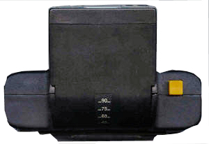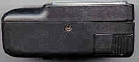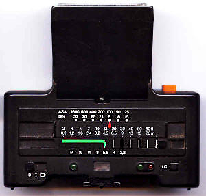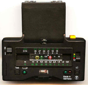 Von hinten. Man sieht den Blendenschieber mit den Grundblendenöffnungen bei 21 DIN; 2,8; 4: 8. Der Schieber rastet in Zwischenstufen ein und die 3 Blenden werden mit Leuchtdioden angezeigt. Einen eigenen Batterietestknopf hat es auch, ebenso wie die Funktion eines Probeblitzes, welche mit der Taste LC ausgelöst wird. Grüne Diode ist genug, rote ist zuwenig Licht; sehr nützlich bei geschwenktem Blitzkopf.