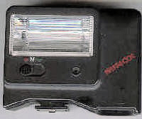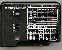 Von vorne. Die zwei Blenden des Blitzcomputer werden vorne eingestellt. M heißt soviel wie Manuell, also Leitzahl 18 bei 21 DIN.