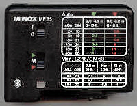 Die Minox AL brauchte auch einen eigenen Blitz, ohne Computer und mit möglichst wenig Bedienelementen und Einstellungen. So kam es zum FA35. Dieser ist ein FC35 ohne alle Extras: Keine Computer, keine Blendeneinstellung kein Serienthyristor, nicht mal einen einen Blitzauslöseknopf. Er arbeitet wie ein FC35 in der Einstellung, oder besser Ausstellung, des Computer auf „M“ wie manuell. Also immer den Blitz auf „Volle Pulle“. Mit der Leitzahl von 14 bei 21 DIN/100ASA und einer größten Blendenöffnung bei f4 heißt das etwa eine maximale Blitzentfernung von ca. 3,5 Meter (Leitzahl durch Blende). Dementsprechend sind die Blitzsymbole gestaltet: Ein bis drei Männchen, 3 Personen passen in einer Entfernung von 4,5 gut in das Bild. Für die schwarze Ausführung der Al gibt es den FA35 auch in schwarz.. Ein FC auf „M“ gestellt tut es auch. Warum man den Blitz in der Ausstattung so beschränkt hat ist mir schleierhaft.