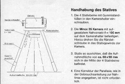 Die Stative sind entweder die gleiche Stative wie für die 8x11mm „Kaugummipäckchen“ Camera-Serie, bzw. etwas abgewandelte Modelle. Die „Taschenstative“ sind sehr elegant und stabil gebaut. Der Zusammenbau aus einem Stift und die Integration des Drahtauslösers ist sehr raffiniert gelöst. Da die Minox, je nach Ausführung und Filmempfindlichkeit, bis zu 3 Sekunden (und teilweise länger) belichten können, lohnt sich ein Stativ schon. Das Makrostativ hingegen ist wohl eher etwas für den Sammler.