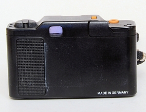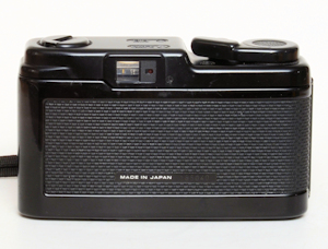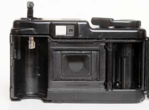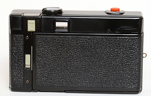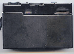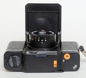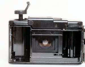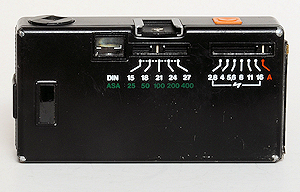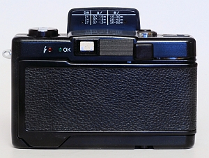 Die Rückwand ist mit dem Gehäuse verbunden und ist rechts angeschlagen. Die Belichtungs-LED ist kaum sichtbar, da sie sich in einem kleinem Loch am linken untern Rand des Okular befindet. Die Filmempfindlichkeit wird hinten eingestellt und erlaubt die