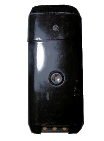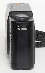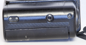 Die Ansicht von Vorne im geschlossenem Zustand, das unbedeckte Fenster ist nicht etwa der Sucher, sonder ein Fenster des Autofokus sowie das Belichtungsmesserfenster. Eingewillig warum gerade diese ungeschützt bleiben. Ansonsten: Full plastic-jacket. Es gibt keinen Hebel oder Knopf um die Klappe zu öffnen, welche links (Sicht von vorne) angeschlagen ist. Das recht ein Blitz versteckt ist lässt sich nicht ahnen. Auf der linken Seite, neben der Befestigung für die Trageschlaufe findet sich die Batterie, eine 3 Volt Lithiumzelle vom Typ 123 A.