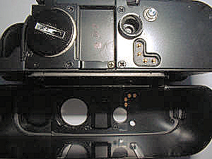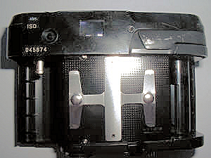 Auffällig sind die 4 im Winkel angebrachten Kontaktstifte, am Boden des Deckels haben sie Gegenstücke ohne Funktion. Muss wohl für eine Datenrückwand oder gar einen Motorwinder gedacht gewesen sein.