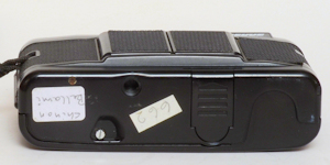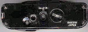 Von unten sind die deutlich größeren Abmessungen der Lomo zu erkennen, ebenso der Schieber für den Objektivschutz und das Stativgewinde. Batteriefach (3 mal L1154) und Rückspulsperrenknopf.
