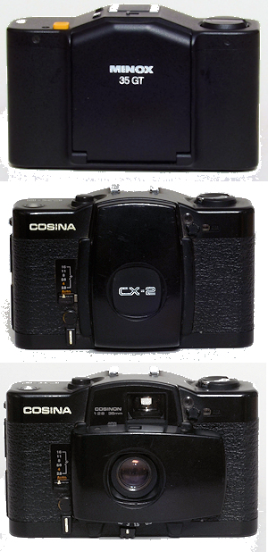 Deutliche Ähnlichkeit, nicht? Die Ähnlichkeit zu den Minox 35 Cameras ist diskutabel, aber meiner Ansicht nach nicht zu verleugnen, besonders das Profil. (Cosina CX-1,CX-2, … Einige wurde auch von Petri mit eigene Nahmen verkauft -LJo)