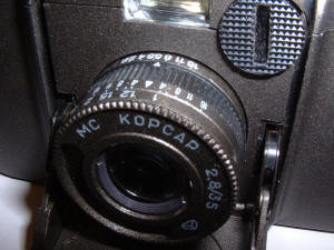 Das Objektiv ist ein Korsar F2,8 und 35mm, scheinbar MC-vergütet, wer’s glaubt. Die Entfernung kann bis 1 Meter eingestellt werden.