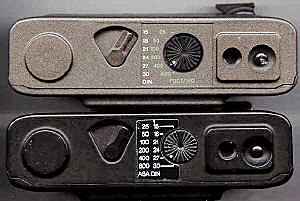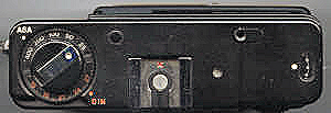 Um dem Rückspulknopf ist die Einstellung der Filmempfindlichkeit, von 25 bis 400 ASA. Links oberhalb des Blitzschuhs sieht man den Knopf zur Überprüfung der Batteriespannung, die LED gleich rechts neben dem Blitzschuh leuchtet bei ausreichender Spannung rot auf. Vorne recht der ovale Auslöseknopf mit Drahtauslösergewinde, hier ist der Auslöseknopf eingefahren. Ganz rechts das Filmzählwerk.