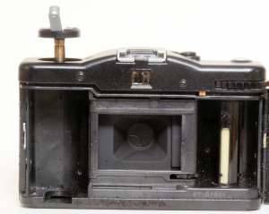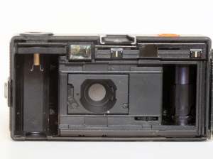 Hinten ist noch weniger zu sehen, dafür aber Sicht auf die Filmpatrone, dann weiß man wenigstens was für einen Film man eingelegt hat. Wie man sieht wird der Film von rechts nach links transportiert (von hinten gesehen). Die Kamera ist laut Aufkleber aus Japan, hätte man kaum vermutet…