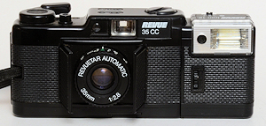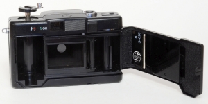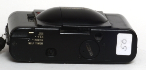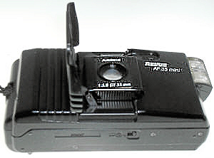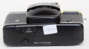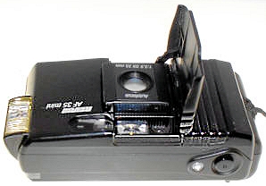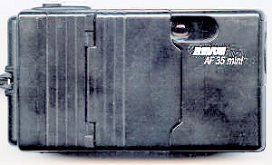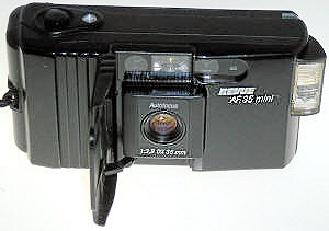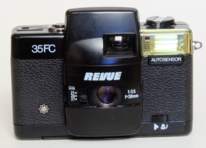 Die Firma Quelle, unter dem Handelsnamen Revue, ist eine wahre Fundgrube für Kameratypen. Ihre Aufkäufer haben in aller Welt Kameras eingekauft, kein Wunder also, das auch mehrere Plagiate unter dem Namen Revue laufen. So auch die 35 AF. Nun, ein echtes Plagiat ist diese Kamera auch nicht, es gibt zwar eine seitwärts öffnende Klappe, aber das Objektiv wird nicht ausgefahren. Wie der Namen schon sagt, handelt es sich um eine Autofokuscamera, alles andere ist auch automatisch, es gibt nichts zum Einstellen, nichts zu sehen im Okular. Im Sucher gibt es einen Rahmen für das Aufnahmefeld, einen inneren „Zielkreis“ für den Autofokus und eine rote LED in der linken oberen Ecke wenn die Automatik der Meinung ist das die Aufnahme nicht klappen kann. Sehr spartanisch. Drückt man leicht auf den Auslöser fängt der Autofokus an ziemleich laut zu surren. Beim Öffnen der Frontklappe springt auch an der linken Seite ein winziger Blitz hervor, man kann ihn von der Frontklappe getrennt wieder einschieben und somit ausschalten. Die Filmempfindlichkeit wird DX-Kodiert automatisch engestellt, wobei ich mich frage, was mit 2 Abtaststiften eingestellt werden kann, eigentlich kann fast nur die Anwesenheit eines Filmes gemeldet werden. Die Form ist sehr gefällig und die Kamera liegt angenehm in der Hand.