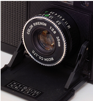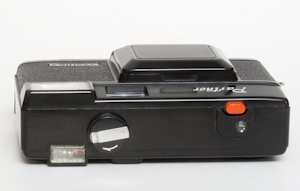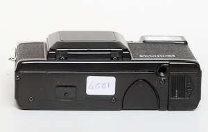 Sieht ganz schnuckelig aus, soll auch von Porsche entworfen worden sein. Ich nehme an, das der Name und der Hersteller des Objektivs schon für Qualität sprechen. Mit dem Knopf auf der Frontseite, in Flucht mit dem Auslöser wird die Objektivklappe geöffnet. Schnappt auf, muss aber noch von Hand ganz herausgezogen werden. Gleichzeitig wird die Elektronik aktiviert. Das Objektiv ist ein Sonar 38 mm 1:2,8. Am oberen Objektivrand ist die Siliziummesszelle zu sehen. Wie bei der Minox ein Zeitautomat mit Zeiten von 8-1/5000 Sekunde. Die Entfernungsmarkierungen sind von links nach rechts 1-1,3-2-4-Unendlich. Die Blenden , auch von links nach rechts 2,8-4-5,6-8-11-16. Für f8 und circa 3,8 m ist eine grüne Schnappschusseinstellung markiert: