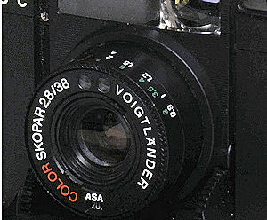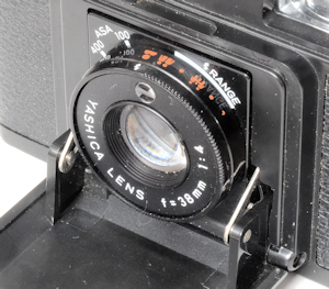 Von Vorne sieht man die Rändelschraube zur Befestigung des Blitzes und das geöffnete Scheunen-Tor. Oberhalb des Objektives, neben dem Sucherfenster findet sich die CDS-Meßzelle. Das Objektiv hat eine maximale Öffnung von f2,8 und eine Brennweite von 35mm, 4 elemente in 3 Gruppen, das klingt nach Tessar.