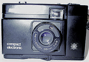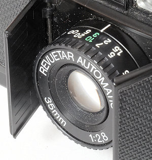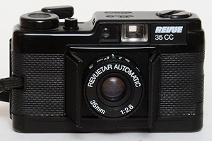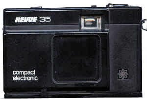 Der Quelle-Versand hat noch einen weiteren Klon vertrieben, der original Hersteller dieser Kamera ist mir unbekannt. Wie alle hier beschriebenen Revue-Kameras hat auch diese Kamera einen „Zwilling“, die Vivitar 35 EM. Letztere hat als einzigen Unterschied eine Anzeige der Zeiten durch die Belichtungsmessernadel im Okular. Auch hier öffnet sich die Klappe nicht wie ein Balgen, sondern gleitet zur linken Seite (von vorne gesehen), dafür schiebt sich das Objektiv (35mm , F2.8) ganz Minox-ähnlich heraus. Überhaupt sieht das Objektiv, abgesehen von Lichtstärke und Brennweite mit der Blendensimulation über eine Schlitzblende dem Minotar sehr ähnlich. Originell ist die Bedienung der Objektivöffnung und Versenkung über einen Hebel am Boden der Kamera. Die Masse sind 107x35x69mm und 270 Gramm schwer, also deutlich größer und schwerer als eine Minox. Die Kamera ist in gemischter Kunststoff/Metall-Bauweise gefertigt. Die Kamera ist ein Zeitautomat, die einstellbaren Blenden sind 2,8;4;5,6;8;11;16 , über die möglichen Zeiten lässt sich das Anleitungsheft, ebenso wie die Synchronisationszeit des X-Kontaktes, nicht aus. Es gibt