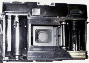 Keine Blendeneinstellung. Die Filmempfindlichkeit wird am Objektivring eingestellt. Die Entfernungseinstellungs-Symbole werden im Sucher eingespiegelt, deshalb noch ein zweites, mattes, Sucherfenster. Zwei Messzellen. Insgesamt ist das Sichtfenster gut geraten: Sehr hell und gut einsehbar, eigentlich das Einzige, was an dieser Kamera wirklich besser als bei den Minox-Cameras ist. Obwohl der klappbare Objektivtubus mit dem Deckel sehr dem Minox-Entwurf ähnelt, zeigen schon die Zahnräder, dass hier nicht der gleiche Mechanismus verwandt wurde. Anstatt mit Kreuzgelenken, wird der Tubus über ein