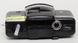 Rechts das Bildzählwerk. Der Auslöser macht ganz schön Krach, nicht so diskret wie bei der Minox. Leicht eingedrückt zeigt er Unter- und Überbelichtung mit einer roten LED im Sucher an. Eine zweite rote LED zeigt den Batteriezustand an. Die Blitzabdeckung der Minox Cameras hat auch ihre Nachahmer gefunden….