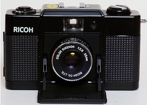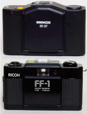 Eine weitere ziemlich nahe Kopie der Minox Cameras ist die Ricoh FF-1 (Baujahr 1980). Sie ist ganz aus Metall. Im Umfang der Funktionen ähnelt sie am ehesten der Minox AL: Nur die Entfernung ist zum Einstellen. Blende und Zeit wird durch eine Zeitautomatik eingestellt. Ein einfacher, schlecht einsehbarer Leuchtrahmensucher ohne weitere Anzeige. Eine grüne LED links neben dem Okular zeigt ein an ob die Beleuchtung ausreicht oder nicht. Im Vergleich zu den Cameras ist sie etwas breiter und tiefer: