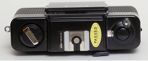 Von hinten ist nicht viel zu sehen, nur die Schraube des Blitzes und der Blitzschalter. Die Birne für die Blitzbereitschaft ist auf der Oberseite. Die Blitzbereitschaft wird im Sucher durch die Blinken der untersten /1/30Sekunde) LED angezeigt. Interessant ist die Einstellung der Filmempfindlichkeit (von 25 bis 100 ASA). Die eingestellte Empfindlichkeit ist in dem Fensterchen links oben unterhalb der Rückspulknopf zu sehen. Die Bei