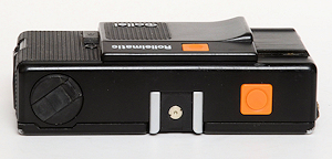 Der kleine viereckige orangen Schieber dient zum abheben des Filmspannhebels, eigentlich ziemlich nutzlos aber auch um Gegenlicht zu kompensieren mit x2. Das Fenster mit dem Pfeil neben dem runden orangen Auslöser zeigt an, ob der Verschluss gespannt ist. In dieser Position ist er gespannt, zeigt der Pfeil nach hinten, ist er es nicht. Einen Blitzschuh gibt es nicht.