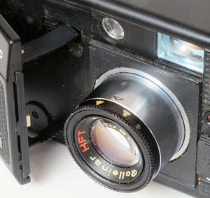 Diese Kamera ist, ob wohl es eine „Klappe“ hat, eigentlich auch kein Plagiat. Die Klappe öffnet sch nicht wie bei den Balgenkameras sondern wie ein Scheunentor. Ganz pfiffig, aber der Zugang zum Objektiv ist dadurch etwas verbaut. Zu der Kamera gehört ein Systemblitz (Leitzahl 12 bei 100 ASA), der wieder seitlich angeschraubt wird.