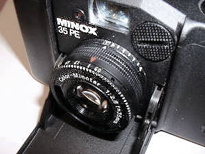 Außer in dem fehlenden grünen Punkt zur „Schnappschusseinstellung“ unterscheidet sich die Ansicht des Objektivs nicht von der der PL. Das Objektiv ist ein Minotar. Die Blendeneinstellung ist nur bei Blitzbetrieb einzustellen und zeigt Buchstaben anstatt Zahlen: