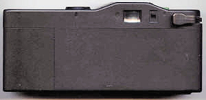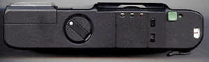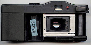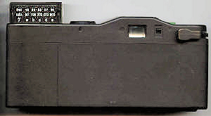 Auch noch die lästige Filmeinfädeltrommel. Selbstauslöser ist aktiviert. Der blaue Kleber zeigt, dass die Kamera schon mal repariert wurde.