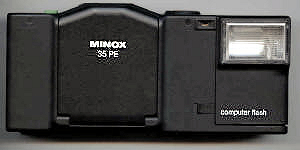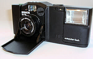 Neben dem Schriftzug computer flash findet sich eine Schiebetaste, in Richtung Objektiv gedrückt springt dann der Blitz heraus. Am oberen Rand findet sich der Sensor für den Blitz, die CDS-Zelle im Objektiv steuert nicht den Blitz.