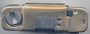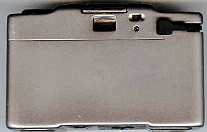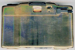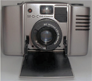 Man sieht gleich das größte Problem: Kratzer und Fingerabdrücke. Wobei die Camera im Original besser als auf dem Scan aussieht. Unter dem Sucher der Schriftzug M.D.C und „Made in Germany“ bei geöffneter Klappe sichtbar.