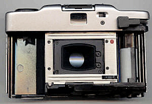 Der Selbstauslöser sitzt hinten. Der Blick durch das Okular: