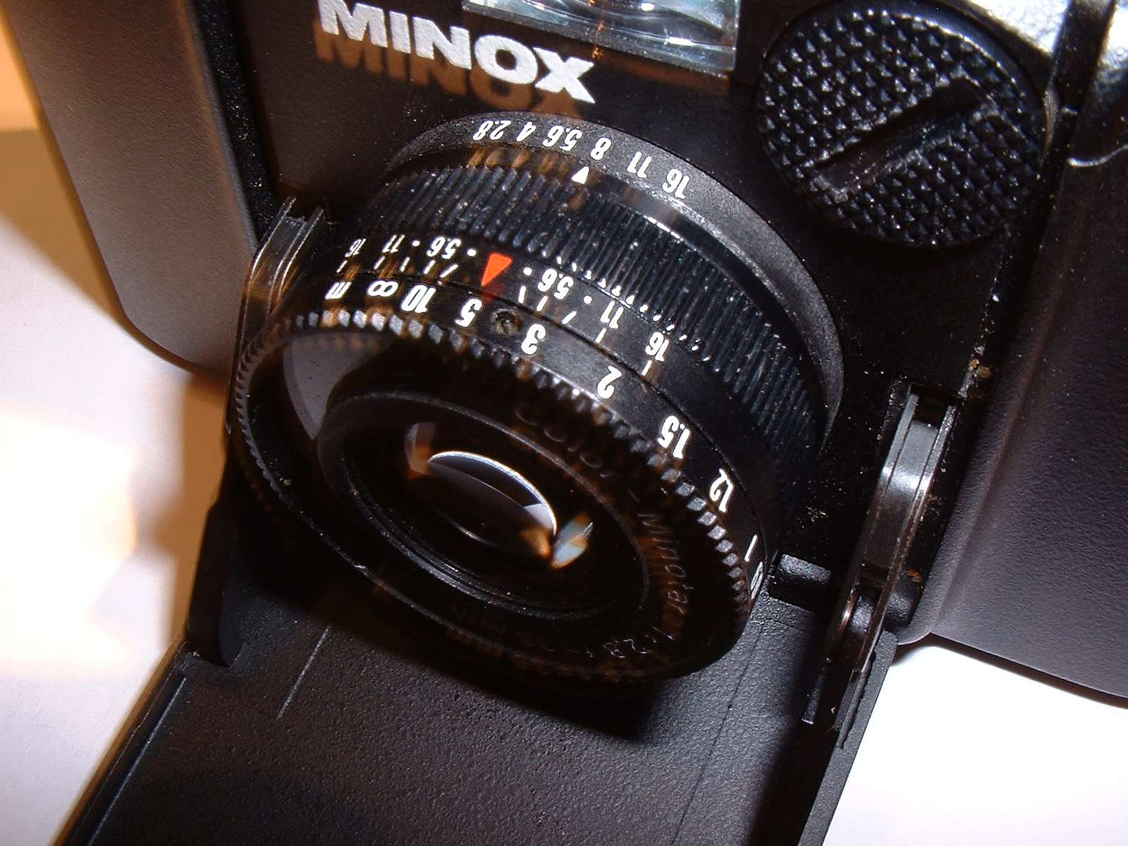 Der Blitzschuh erhielt eine taschenfreundliche Abdeckplatte. Ist leicht zu verlieren. Auf der Unterseite erkennt man die Aussparung für die Umschalttaste. Man sollte nicht die Abdeckplatte eines anderen Minox-Modells in den Blitzschuh schieben, sondern nur eine für die GL, nur diese hat die Aussparung vorne, die anderen seitlich. Sonst photographiert man immer mit der Verschlusszeit von 1/125 Sekunde.