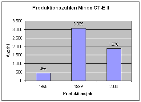 - Produziert wird die Camera nicht mehr, aber kaufen „neu“ kannman sie noch, es gibt sie im „Set“ mit dem passenden Blitz. Ab Oktober 2003 werden die letzten Modelle der Minox 35 mm Cameras (GT-S+GTE-II) auch nicht mehr über die Minox-Homepage angeboten.