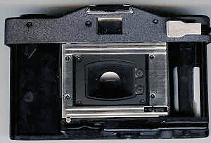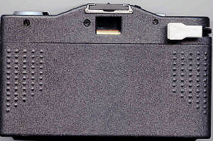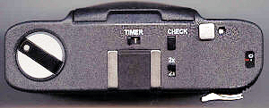 Der Typenschriftzug ist direkt unter der Selbstauslöser-LED und im schlichten weiß gehalten. Überhaupt hat die Camera nicht viel Farbe, nur der Zählwerkszeiger und der obligate Punkt an der Rückwandverriegelung sind in Rot. Der Batterieadapter für die 2mal 1/2 CR/3 ist auch wie üblich bei den „neueren“ Cameras. Der Schriftzug ist wieder nur bei geöffneter Klappe unter der Selbstauslöserdiode sichtbar.