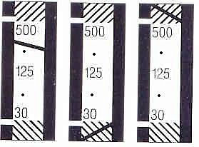Das bekannte Zeigermeßsystem. Das Bild entspricht dem Sucher der EL, bei der GTE-II sind noch die Zwischenwerte 1/250 Sekunde und 1/60 Sekunde durch Punkte dargestellt (ist auch in der Gebrauchsanleitung „falsch“ abgebildet und wurden von mir nachträglich eingezeichnet).
