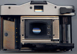 Die wesentliche Veränderung im Vergleich zu der GT-E/GT-E-II ist die Erkennung der DX-Kodierung, deren 4 Ablesestifte links in der Filmaufnahmetrommel zu sehen sind. Mit 4 Stiften, von denen 3 kodieren und einer die Masse bildet, sind nur die Empfindlichkeitsstufen ISO 25-50-100-200-400-800-1600-3200 möglich, jedes mal ein Verdoppelung der Empfindlichkeit. Ganz schön clever aufgebaut. Ein ISO 64 Film wird wie ein ISO 50 oder 80 gelesen.