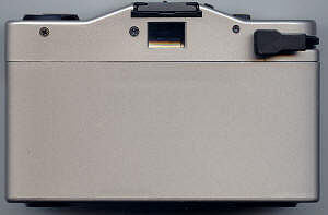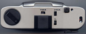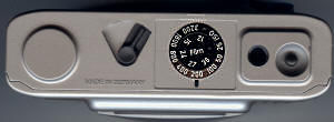 Die Ansicht von oben zeigt auch keine Veränderungen im Vergleich zur GT-E, gleich Anordnung und Bedienung der Elemente, welche aber hier sauber, in schwarzer Schrift, beschriftet sind. Das Feld für den Bildzähler ist, wie bei der Goldknopf in weiß auf schwarzem Hintergrund gehalten. Der Bauch der Frontklappe ist gut zusehen, der Preis für den eingebauten Skylightfilter. Der Auslöseknopf ist schwarz, ebenso die Rückspulkurbel und die Knöpfe. Kein Schriftzug wie bei der GT-X.